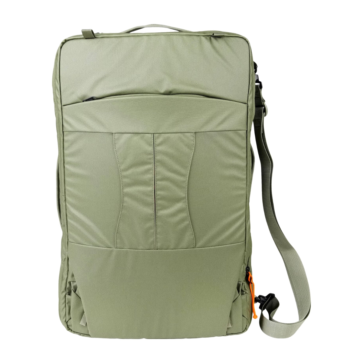 Versatile 3‑way carry: stowable backpack straps, removable shoulder strap, or grab bag handles—plus a pass‑through sleeve for rolling luggage.